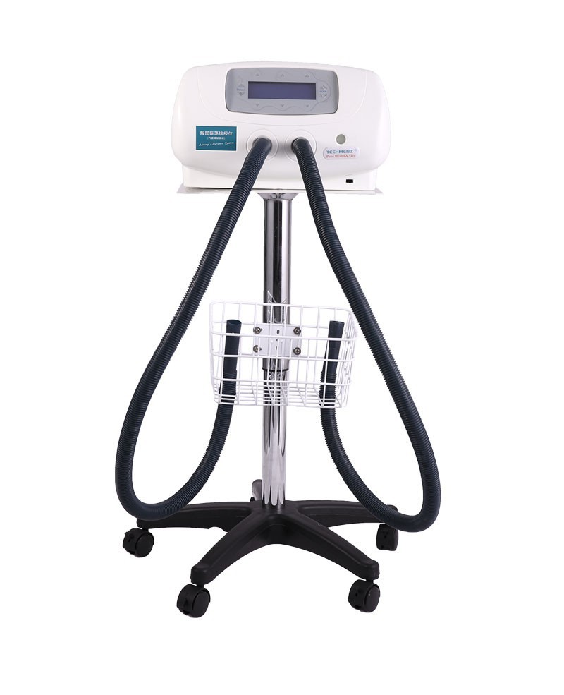 工作原理: 包括空气脉冲发生器 、充气背心 、束带 。采用高频胸壁震荡技术 主机快速的充气和放气 使背心/束带使患者的胸壁产生高频的振动 。从而使得粘稠的痰液松动 、脱落 、稀释 聚集 同时刺激气道壁的纤毛摆动, 将痰液转移至主支气管和口腔排出。